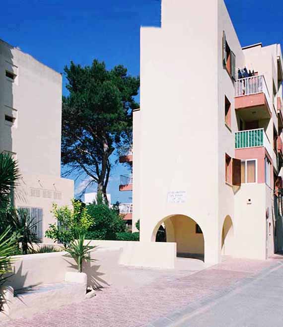 LOS PINOS A-2-2 TWO BEDROOM Second floor apartment located the sea front in Bahia de San Antonio. Two (twin and small single) bedrooms to sleep maximum three people with fitted wardrobes, bathroom with washing machine. lounge/dining room with terrestrial television, balcony/terrace with table and chairs. Small kitchenette with gas hob, microwave, fridge and single sink unit. Kitchen utensils, pans, crockery, cutlery and bedlinen provided.